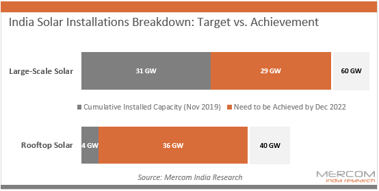 Nach Angaben von Mercom India Research deutet der Zusammenbruch der indischen Solaranlagen darauf hin, dass große Solaranlagen die Hälfte ihrer Gesamtkapazität von 32 GW in Betrieb haben, während noch 29 GW an Projekten entwickelt werden müssen, um die Aussichten zu erfüllen 60 GW bis Dezember 2022.